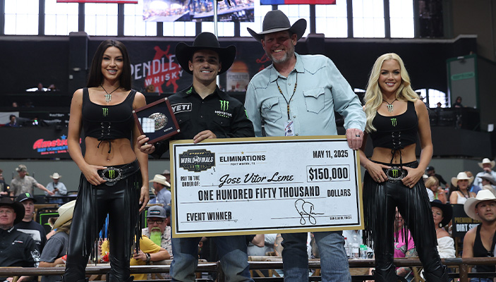 No início da noite deste domingo (12), o bicampeão mundial José Vitor Leme conquistou a vitória na Eliminatória (Elimination Rounds) da PBR World Finals. O evento decisivo realizado no Cowntown Coliseum em Fort Worth no Texas (EUA) é uma espécie de semifinal da temporada e definiu os 20 atletas classificados que competem no AT&T Stadium no próximo fim de semana.